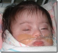 Two pictures of Bella, one ready to eat and the other, blissfully slipping into sleep as the NG tube takes care of that second required ounce.