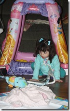 later on the girls were dancing. Usually she wants to “dance” with them. That night all she could do was watch. But I did pick her and bounce with her a bit!